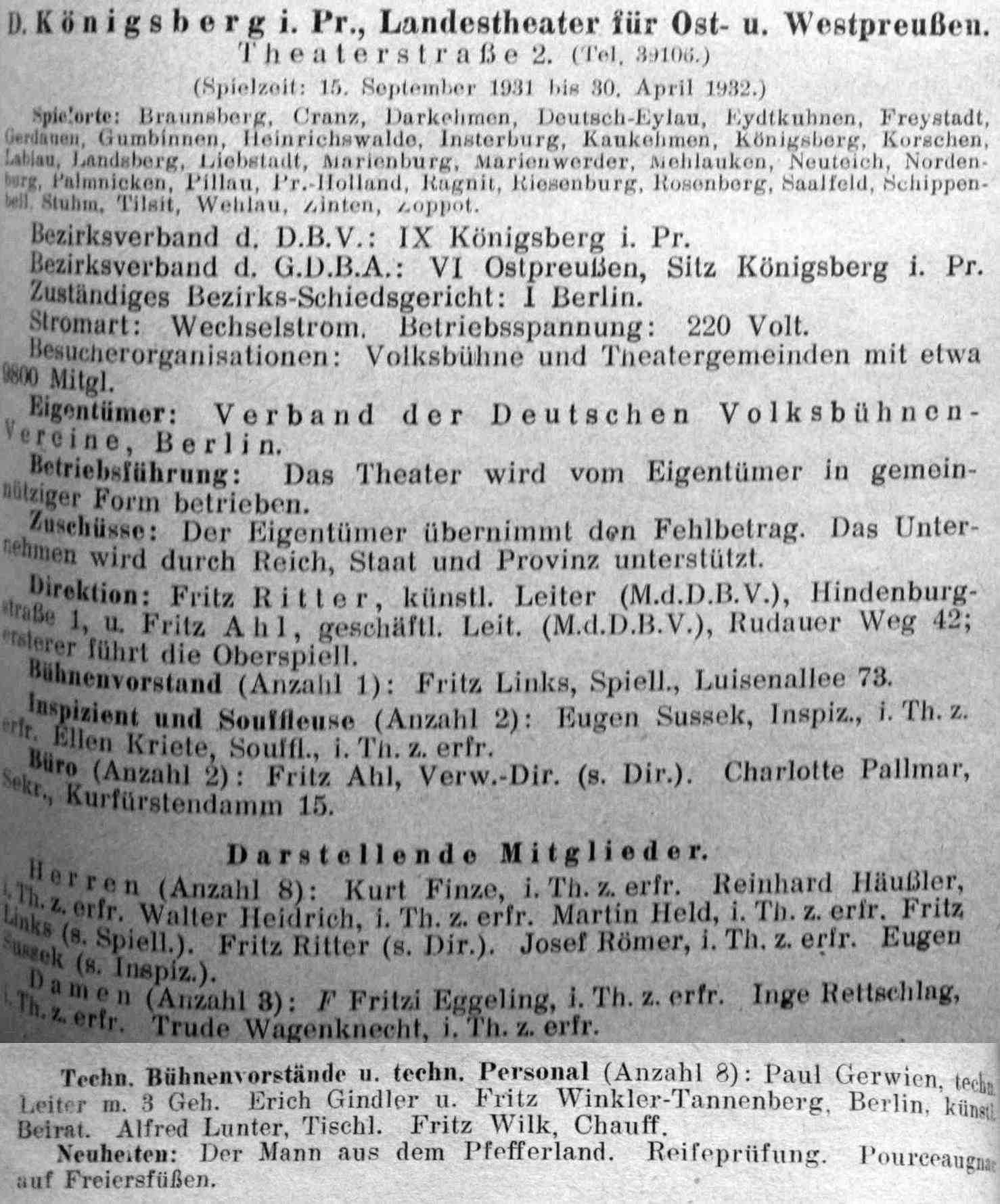 Das Landestheater für Ost- und Westpreußen bediente etwa 30 Städte (Details in den Spielplänen); darunter befanden sich mit regelmäßigen Auftritten in Tilsit und gelegentlichen in Königsberg auch Orte, die selbst über ein lokales Theaterangebot verfügten. – Die Saison 1931/32 trug den Charakter des Umbruchs: Zwar fungierte das Landestheater für Ost- und Westpreußen noch als selbständige Institution (s. Abb. unten), arbeitete aber sehr eng mit dem Stadttheater Tilsit zusammen, das wenige Jahre später tatsächlich die ländliche Versorgung dauerhaft übernehmen sollte. 1931/32 wurden die Spielpläne unter dem Rubrum "Stadtheater Tilsit (Landestheater für Ost- und Westpreußen)" gemeinsam aus Tilsit gemeldet. Sie sind deshalb unter den Tilsiter Spielplänen zu finden.